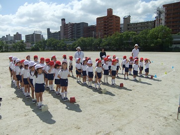 今週はお天気に恵まれず、今日はじめて大きなグランドで練習をしました。 園庭よりひろ~~い場所での練習に、心も弾みます。 暑い中、たくさんたくさん頑張った子ども達。 日に日に・・・みんなの気持ちが合ってきていますよ。 今日は疲れていると思いますので、ゆっくりお休み下さいね。